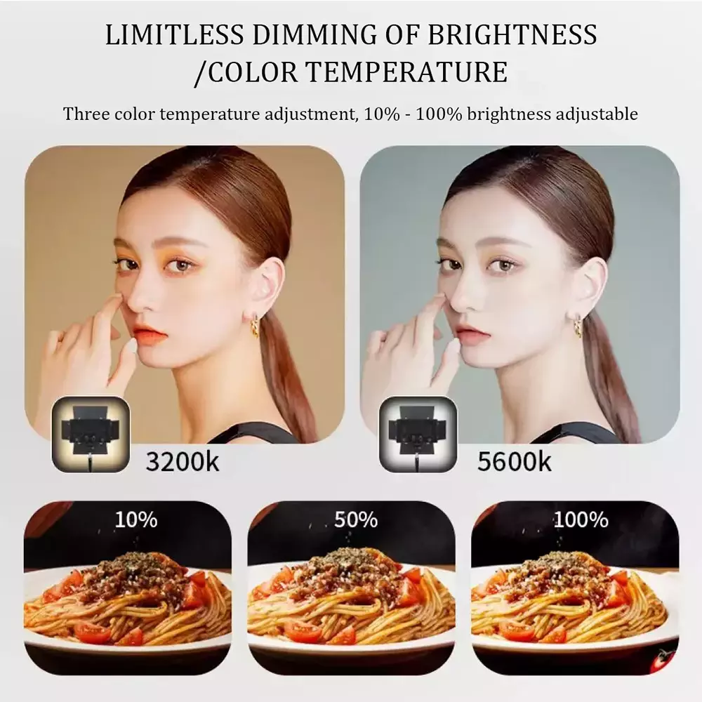 Esta luz LED possui temperatura de cor bi-color ajustável entre 3200K e 5600K, permitindo adaptar a iluminação para diferentes ambientes, desde luz quente até luz fria. O brilho é facilmente regulável, variando de 10% a 100%, para que você controle o efeito exato que deseja em suas imagens ou gravações.